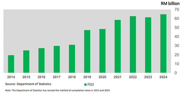말레이시아는 동남아시아 주요 플라스틱 생산국 중 하나로, 포장·자동차·전자 분야를 중심으로 플라스틱 수요가 빠르게 늘고 있다. 2024년 기준 플라스틱 산업 매출은 전년 대비 5.4% 증가했고, 수출은 8% 상승했다. 주요 수요처는 포장(44%), 전기전자(29%), 자동차(12%), 건설(6%) 등으로 산업 구조가 비교적 안정적이다. 말레이시아 통계청(DOSM)에 따르면 2024년 플라스틱 제품 수출은 173억4천만 MYR (약 40억3000만 USD)로, 플라스틱백과 필름·시트류 수출이 각각 5.0%, 3.1% 증가했다. 다만 재활용 플라스틱 원료의 상당 부분을 해외 수입에 의존하고 있어, 말레이시아는 여전히 세계 상위 5개 플라스틱 폐기물 수입국 중 하나로 분류된다.