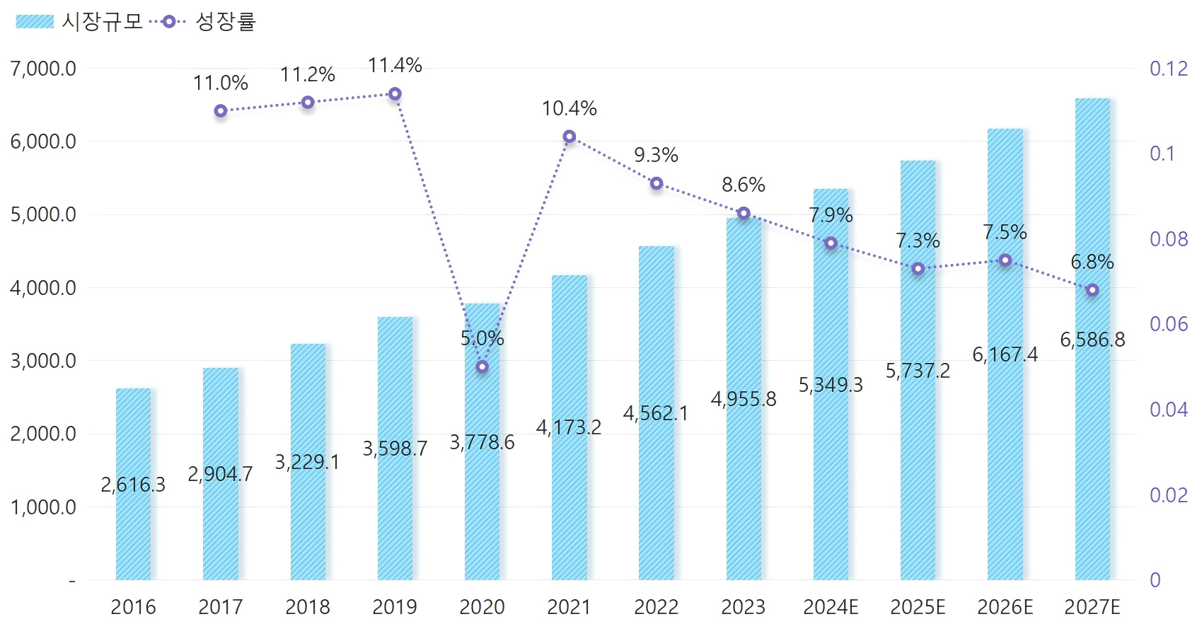 <2016~2027년 중국 수면경제 시장규모 추이>