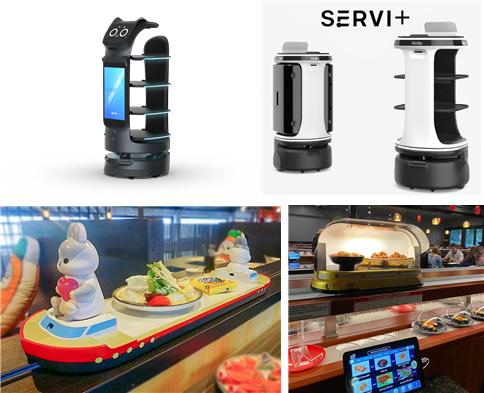 <대만 요식업계에서 활용되는 서빙 로봇(상: 자율주행형, 하: 레일형)>