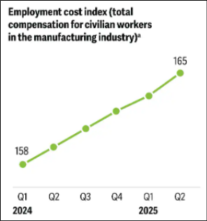이러한 인력난은 노동비용 상승으로 직결되고 있다. 미국 제조업 인건비지수는 2024년 1분기 158에서 2025년 2분기 165로 상승했다. 이는 제조업 노동자에게 지급되는 임금·복리후생 등 총 보상비용이 1년 반 동안 꾸준히 증가했다는 의미로, 숙련 인력 확보 경쟁이 치열해지고 인력난이 계속되고 있음을 보여준다.