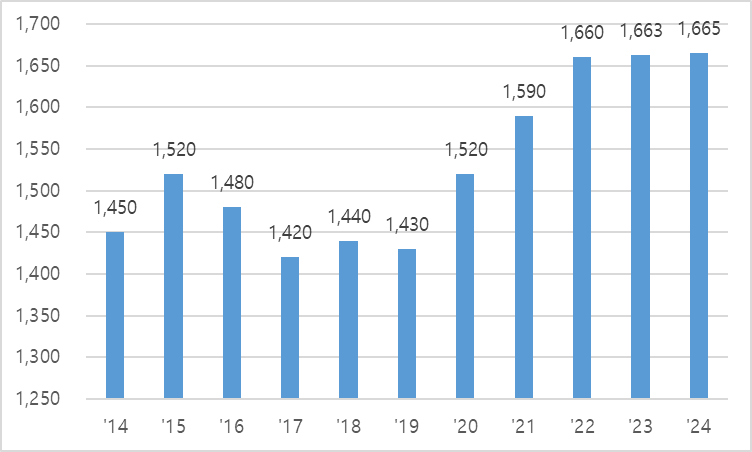 주방용품(조리 기구·커트러리)의 2024년 소매 시장 규모는 전년 대비 0.1% 증가한 약 1665억 엔으로 추정된다. 2019년 이후 완만한 증가세를 보이고 있다. 그러나 원자재 가격 급등 등의 영향으로 실질 수요는 감소한 것으로 보인다. 주방용품은 해외 생산 및 수입 비중이 높은 품목으로 중국·한국·동남아시아에서의 수입이 많다. 일본 제품은 알루미늄·구리·철 등 전문 요리사가 사용하는 조리 기구 외에도 기능성을 강화한 가정용 조리도구가 주로 유통되고 있다.