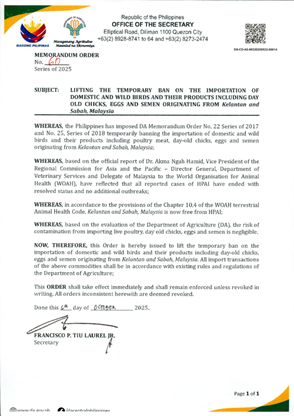 2025년 10월 9일, 필리핀 농업부(Department of Agriculture, 이하 DA)는 아제르바이잔, 카자흐스탄, 사우디아라비아, 슬로베니아, 스웨덴, 그리고 말레이시아의 클란탄(Kelantan)·사바(Sabah) 주에 대한 가금류 및 관련 제품의 수입금지를 공식 해제했다. 이번 결정은 해당 국가와 지역에서 고병원성 조류독감(Highly Pathogenic Avian Influenza, HPAI) 발생이 완전히 종료되고, 이후 추가 사례가 보고되지 않았다는 각국 수의당국(Veterinary Authorities)의 공식 보고 및 세계동물보건기구(World Organisation for Animal Health, 이하 WOAH)의 검증 결과를 근거로 이뤄졌다.