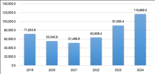 미얀마의 화장품(HS Code 330499) 수입 규모는 최근 3년간 변동을 보였으나 전반적으로 회복세를 유지하고 있다. Global Trade Atlas 자료에 따르면, 2024년 미얀마의 화장품 수입액은 약 1억918만 달러로 전년 대비 6.4% 증가하며 다시 확대되는 흐름을 보였다. 주요 수입국 구성은 태국과 한국이 압도적으로 높은 비중을 차지하고 있으며, 양국 합산 비중은 전체의 90% 이상을 기록하고 있다.