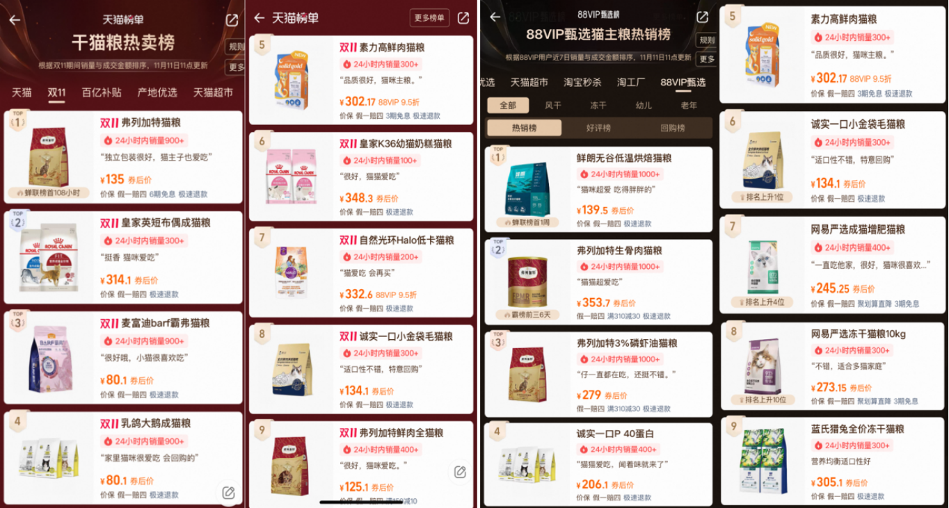 <티몰(天猫) 광군제 고양이 사료 ‘인기 판매 순위’·‘88VIP인기 제품 순위’>