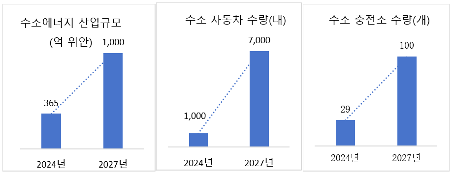 2027년까지 후베이성의 수소 에너지 총 생산액 1000억 위안을 목표로, 수소 에너지 생산액 300억 위안 및 수소 에너지 장비 및 부품 생산액 400억 위안을 달성한다. 이를 위해 10개 이상의 수소 에너지 산업 선도 기업과 100개의 수소 에너지 주요 기업 육성 및 유치한다.