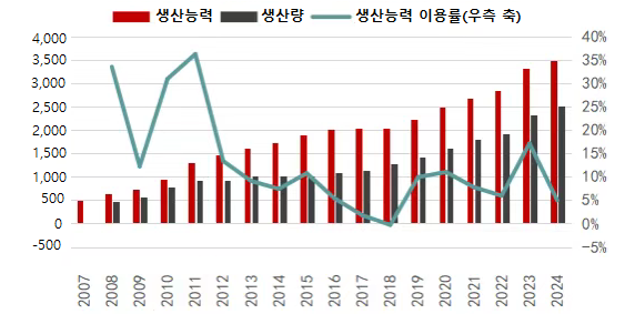 <2007년~2024년 중국 벤젠 생산능력 변화 추세>