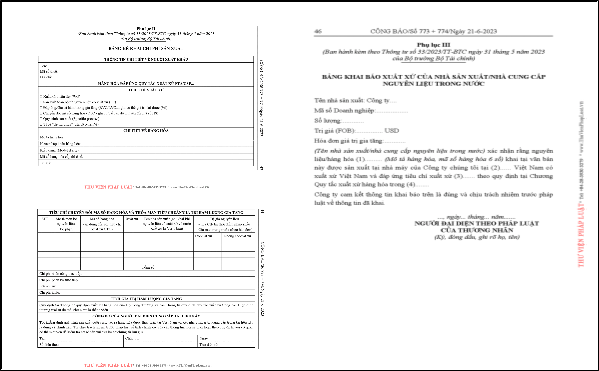 <생산비용명세서 및 원자재 원산지신고서 양식 (33/2023/TT-BTC 부속서 Ⅱ, Ⅲ)>