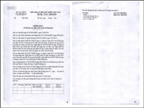 <베트남 사전원산지결정 결과 통보서 (467/QD/CHQ 부록 II, Form 01) >