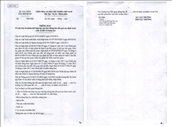이 경우 담당 세관공무원은 관리국장에게 보고 후 사전원산지결정 취소 또는 철회 통보서(467/QD/CHQ 부록 II, Form 02)를 발급해야 한다.