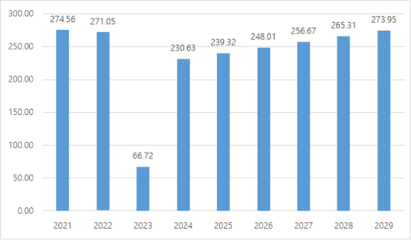 베트남 산업용 로봇 시장은 코로나19 영향이 반영된 2023년 약 6670만 달러 규모로 일시적 급락했으나, 이를 제외하면 전반적으로 회복세를 이어가고 있다. 2021~2022년 시장은 각각 약 2억7460만 달러, 2억7110만 달러로 코로나 이전 확장 흐름을 유지했으며, 이후 글로벌 수요 둔화가 겹치며 2023년 큰 조정이 나타났다. 다만 2024년에는 약 2억3060만 달러로 반등하며 회복했고, 2025~2029년에는 약 2억3930만~2억7390만 달러 수준의 점진적 성장이 전망된다. 이러한 흐름은 제조업 전반의 자동화 수요가 구조적으로 확대되고 있음을 보여주며, 스마트 제조 전환과 글로벌 투자기업의 자동화 설비 확대가 시장 기반을 보다 안정적으로 뒷받침하고 있음을 시사한다.