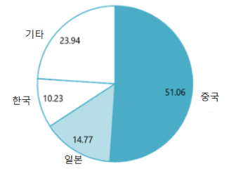 베트남의 산업용 로봇 수입 구조는 특정 국가 의존도가 높은 특징을 보인다. 베트남 컨설팅기업 B&Company에 따르면, 2022년 기준 중국이 전체 수입의 약 51.1%로 절반 이상을 차지하며 압도적인 1위로 나타났다. 이는 가격 경쟁력, 공급량, 부품 접근성 등에서 중국 제품의 우위가 반영된 결과로 해석된다. 일본은 약 14.8%로 2위를 차지하며 정밀 자동화 장비와 산업용 로봇 분야에서 수요를 나타내고 있다. 한국은 약 10.2%를 기록해 베트남 자동화 수요 증가에 따라 안정적인 공급국 역할을 하고 있다.