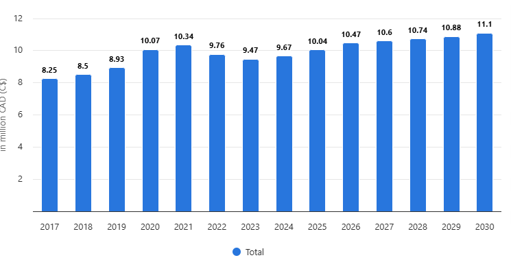 시장조사기관 Statista의 분석에 따르면, 캐나다 드론 시장 매출은 2025년 현재 1004만 캐나다 달러 규모를 형성하고 있다. 드론 매출은 앞으로 연평균 약 2.6%의 성장률을 기록하며 2030년 1110만 캐나다 달러 규모까지 확대될 것으로 전망된다. 주목할 만한 변화는 시장의 수익 구조인데, 지금까지는 드론의 외장재, 모터, 배터리 등 하드웨어 부문이 주요 수익을 창출해 왔으나, 향후에는 물류 및 배송, 농업, 항공 촬영과 같은 서비스 분야가 더 높은 수익성을 보이며 시장 성장을 주도할 것으로 예상된다.