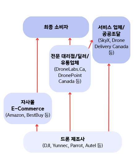 상업용 드론은 고가의 맞춤형 솔루션과 높은 기술 전문성 때문에 진출 지역에서의 고객 지원이 필수적이며, 이에 따라 전문 대리점이나 딜러 네트워크를 활용하는 것이 일반적이다. 예를 들어 DJI는 캐나다 내에 DroneLabs.ca, SpeedyDrone Canada, DronePoint Canada, DrDrone, Volatus Drone Canada 등 약 5개의 전문 대리점을 보유하고 있으며, 이들은 각 지역에서 온·오프라인 판매점을 운영하며 활발하게 제품을 판매하고 있다.
