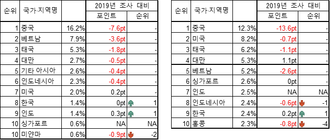 제국데이터뱅크 조사(2025년 12월 2일 발표)에 따르면, 해외 진출 중인 일본 기업을 대상으로 한 '현재 생산 거점·판매 거점으로 가장 중시하는 국가·지역' 조사에서 코로나 이전(2019년) 조사에 이어 중국이 1위를 유지했으나 그 중요도는 크게 하락했다. 조사 항목을 '향후 생산 거점·판매 거점으로 검토할 가능성이 있는 국가·지역'으로 변경해도 상위권 구성에 큰 변화는 없으나, GDP 성장률이 높고 안정적인 비즈니스 환경이 기대되는 베트남, 소비 시장으로서도 세계 최대 인구를 자랑하는 인도, ASEAN 회원국 중 GDP가 가장 높은 인도네시아에 대한 기대감이 높아지고 있다. 또한 생산 거점 부문에서는 베트남이 1위, 중국이 2위인 반면, 판매 거점 부문에서는 1위 중국에 뒤이어(2위 미국, 3위 베트남, 4위 대만)가 바짝 추격하고 있는 점도 '차이나 플러스 원'을 모색하는 움직임이 보인다고 할 수 있다.