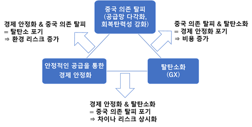 또한 일본 기업들은 매우 어려운 과제를 안고 있다. 일본종합연구소가 보고서에서 지적한 '공급망 재편의 트릴레마'가 그것이다. 트릴레마란 세 가지 사항을 동시에 달성할 수 없는 상황을 의미하며, 여기서는 '중국 의존 탈피(공급망 다각화, 회복탄력성 강화)', '탈탄소화(GX)', '안정적 공급을 통한 경제 안정화'를 세 가지 요소로 삼고 있다. 예를 들어, 전기차(EV)로의 전환을 추진하는 과정에서 배터리 소재나 모터용 자석 등의 중요 광물은 여전히 특정 국가에 대한 의존도가 높다. 환경 대응(탈탄소화)을 서두르면 기존 공급망에 의존할 수밖에 없고, 다각화를 추진하면 비용이 급증한다.도요타 자동차나 파나소닉 에너지 등 대기업들이 배터리 공급망 분산을 모색하고 있지만, 비용과 안정성을 동시에 충족할 수 있는 대체 파트너 발굴은 쉽지 않다. 이러한 '모기업 공장의 고도화', '인도 등 신흥국의 불확실성' 등과 같은 문제 앞에서 일본 기업들이 지금 필요로 하는 것은 '신뢰할 수 있는 파트너'다.