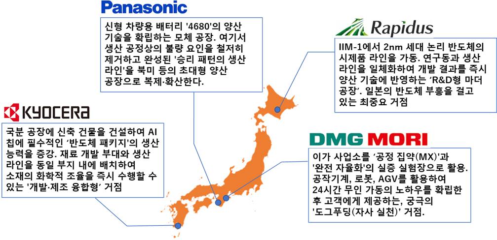 첫째는 국내 생산 회귀. 그러나 단순한 공장이 아닌 '마더 공장화'다. 일본 제조업은 범용 제품의 대량 생산을 해외에 맡기고, 국내 거점을 '고도의 기술 개발과 시제품 제작의 지휘탑(마더 공장)'으로 특화시키는 움직임이 보인다. 국내 회귀를 위한 설비 투자를 추진하며 철저한 자동화로 비용 경쟁력을 유지하는 동시에, 지식재산 비밀 유지 및 조달 안정화를 위해 내재화를 진행 중이다. 이러한 일본 마더 공장이 지금 요구하는 것은 '대량 생산 하청'이 아닌 '고도 시제품 제작에 대응할 수 있는 속도'나 '틈새 기술력'을 갖춘 대등한 파트너다.
