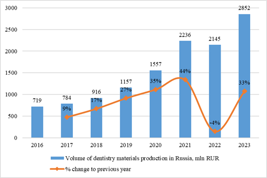 2016-2023년 기간 러시아의 치과 자재 생산량은 4배 증가하였다. 시장 참가자들은 치과 자재의 생산 품목을 확대하고 장비 현대화를 통해 생산 효율을 높이고 있다. ’HydMarket’의 따르면 2023년 러시아의 치과 자재 국내 생산 규모는 28억 5200만 루블로 2022년 대비 33.0% 증가하였다. 러-우 사태로 인해 일부 외국 브랜드가 시장을 떠나고 러 정부가 시행한 ‘수입대체’ 정책으로 인해 국내 자재 소비가 확대되면서 생산 업체들은 자국 혹은 아시아 국가의 공급업체와 협력하고 있다. 러시아 생산자들은 주로 국내 시장을 대상으로 치과 자재를 판매하며 일부 수출(23년 기준 생산량의 12%)을 진행하고 있다.