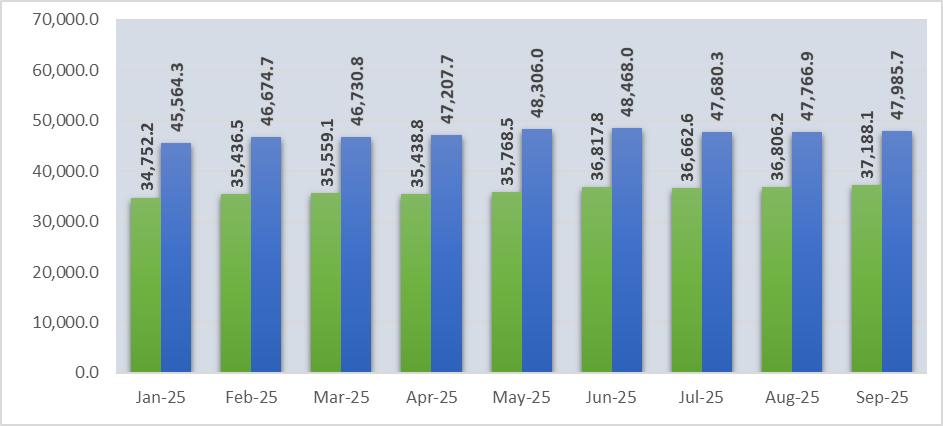 2025년 9월 말 기준, 마나트 기준 협의 광의통화(M2)는 연초 대비 1.5%, 전년 동기 대비 4% 증가하여 372억 마나트를 기록했다. 한편 광의통화(M3)는 3.2% 증가하여 9월 말 기준 480억 마나트를 기록했으며, 이는 전년 동기 대비 5.3% 늘어난 수치이다.
