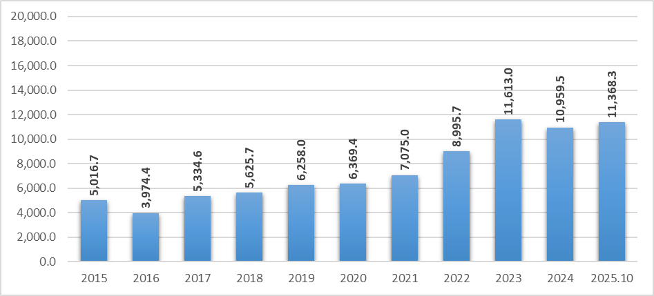 <2015-2025 10년간 아제르바이잔 중앙은행의 외환보유액>