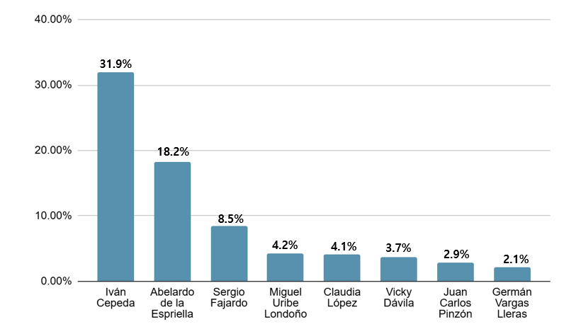 콜롬비아 여론조사기관 Invamer(인바메르)가 2025년 11월 30일 발표한 전국 3800명 표본 조사 결과에 따르면, 현재 대선 지형은 좌파의 초기 우세, 전통 우파 정당 후보의 부진, 극우 및 제3지대 후보의 약진, 중도 단일화 가능성이라는 네 가지 특징으로 요약된다. 특히 전체 응답자의 75%가 상위 8명에게 집중된 반면 나머지 후보군은 대부분 2% 미만에 머물러, 후보군이 넓고 여럿 분산돼 있는 구도이다.