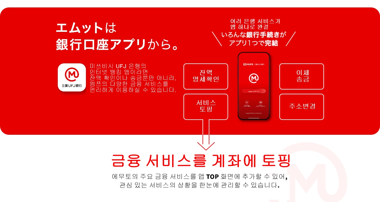 미쓰비시UFJ 파이낸셜 그룹(MUFG)은 미쓰이스미토모와는 다른 노선인 자체 보유주의·자체 개발주의를 택하고 있다. 금융의 핵심 기능을 그룹 내부에 보유하는 것을 기본 방침으로 삼고 이를 중심으로 리테일 비즈니스를 재구축하려는 전략이다. MUFG는 2025년 5월, 개인 대상 신규 금융 서비스 브랜드 에무토(エムット)를 발표했다. 에무토는 스마트폰 앱·카드·포인트·점포를 일체형으로 전개하는 리테일 브랜드로 2026년 하반기에는 에무토를 중심으로 하는 새로운 디지털 은행을 그룹 단독으로 설립할 계획이다. 기존에 KDDI와 공동 출자했던 인터넷은행(現au지분은행)이 2019년 이후 KDDI 자회사로 완전히 편입되며 그룹 밖으로 떨어져 나간 상황에서, MUFG는 에무토용 신규 은행으로 그 공백을 다시 채우려는 것이다.