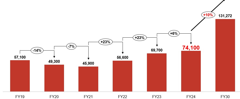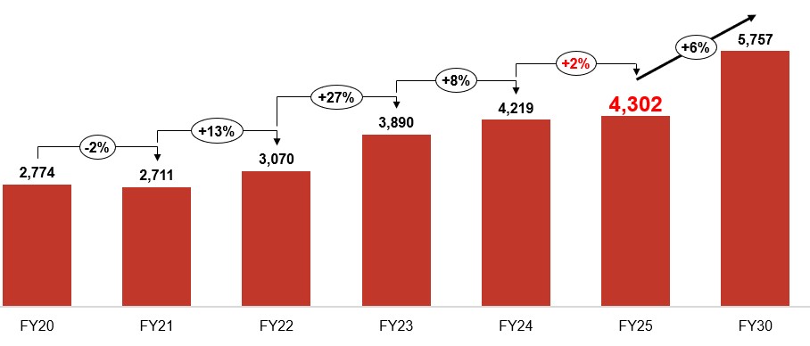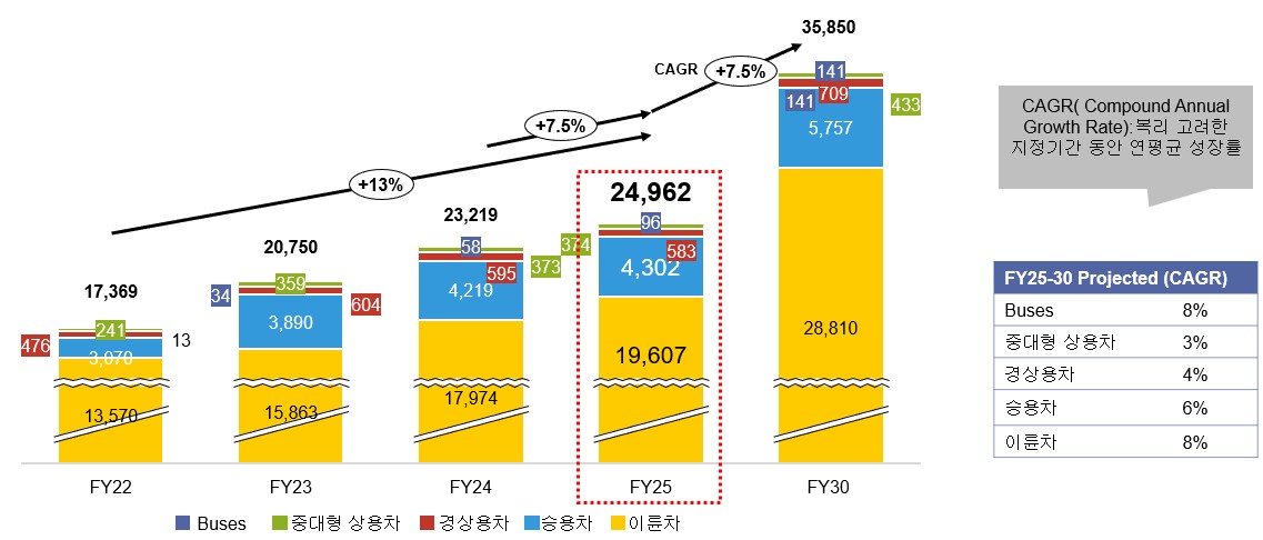 승용차 시장은 FY 2025 기준, 작년대비 2% 성장하며 430만 대가 판매되었으며, 향후 FY 2030까지 연평균성장률 6% 성장하여 580만 대까지 성장할 것으로 예측된다.