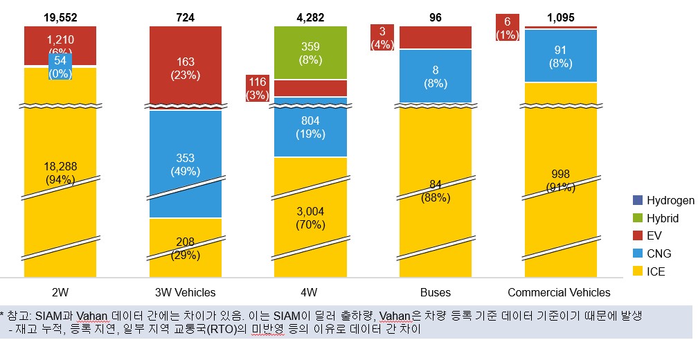 여전히 인도 자동차 시장은 이륜차(2W)와 상용차를 중심으로 내연기관(ICE) 차량이 시장을 주도하고 있으나, 승용차(4W)를 중심으로 대체 연료 차량(CNG/LPG, 전기차, 하이브리드)의 비중이 빠르게 확대되는 추세를 보이고 있다. FY 2025 기준 이륜차의 경우 내연기관 비중이 94%로 절대적인 반면, 승용차는 내연기관 비중이 70%까지 낮아지고 CNG 19%, 하이브리드 8%, 전기차 3% 등 친환경 파워트레인 비중이 이미 30%에 근접했다. 특히 상용차 또한 CNG 비중이 8% 수준까지 확대되며, 버스 역시 CNG 중심으로 대체 연료 전환이 점진적으로 진행되고 있어, 인도 자동차 시장은 ‘내연기관 중심 구조 속 점진적 친환경 전환’이라는 이중 구조적 흐름이 동시에 나타나고 있는 것으로 해석된다.
