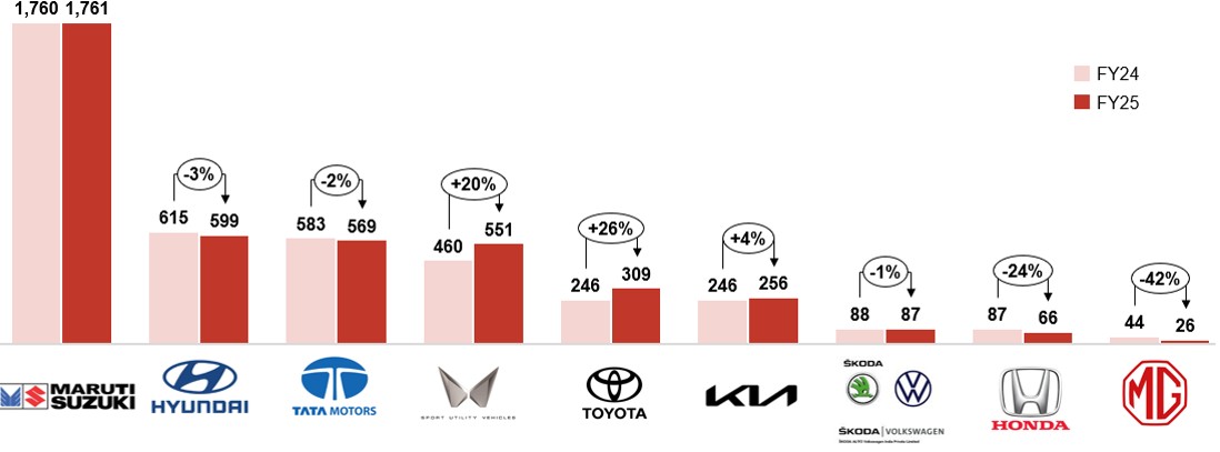 브랜드별로는 Maruti Suzuki가 약 41%의 점유율로 승용차 부문 1위이며, 현대자동차는 점유율 13.2%로 2위를 기록하고 있다. 기아자동차는 지속적인 성장률을 보여주고 있다.