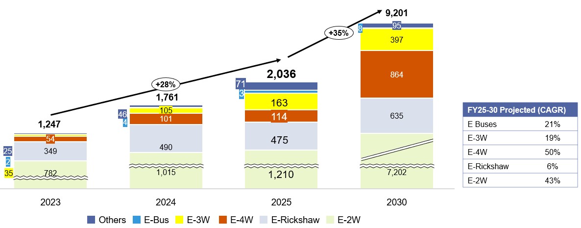 전기차 시장은 향후 5년간 연평균 성장률 35%로 증가할 것으로 전망되고 있다. 아직 전체 자동치 시장 대비 판매량이 미미하나, 연간 성장률이 빠르게 증가하고 정부의 전기차 정책 지원이 이어지면서, 인도 EV 시장은 거대한 잠재력을 품은 초기 성장 시장으로 평가받고 있다.