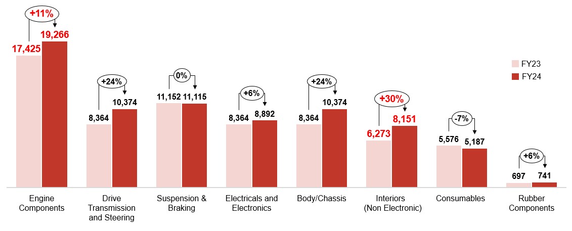 엔진 부품이 가장 높은 가치 비중을 차지하며, 전자 부품이 아닌 내장재 부문이 가장 빠른 성장세를 기록하고 있다.