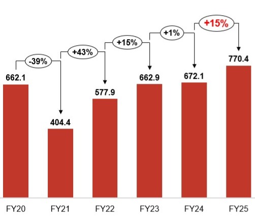 승용차 수출은 FY2021 이후 꾸준히 성장하고 있으며, FY 2025 기준 15% 성장하며 전년도의 1% 대비 크게 증가했다.