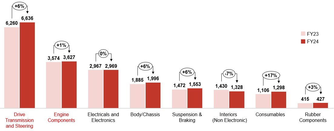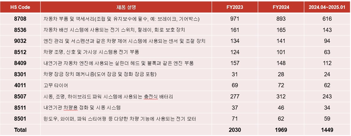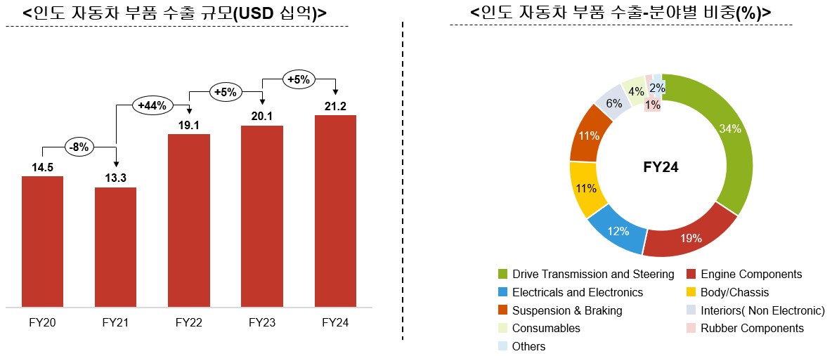 FY 2024 기준 자동차 부품 수출은 5% 증가하여 212억 달러를 기록했으며, 그 중 드라이브 변속기 및 조향 부품이 34%로 가장 큰 비중을 차지하는 것으로 집계되었다.