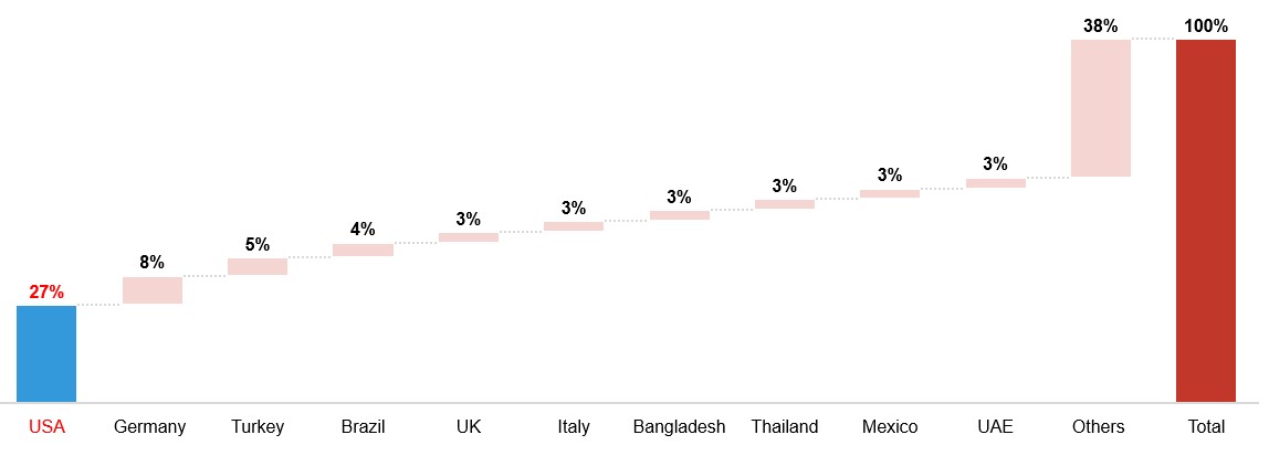 미국은 인도 자동차 부품의 최대 수입국으로, 인도 전체 수출의 27%를 차지하며, 상위 10개국이 전체 수출의 62%를 차지하는 것으로 나타났다.