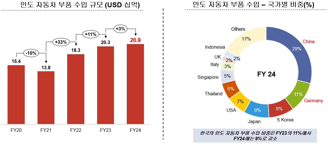 인도의 자동차 부품 수입은 FY 2024 기준 209억 달러로 증가했으며, 이 중 중국, 독일, 대한민국, 일본이 약 58%를 차지하고 있다.