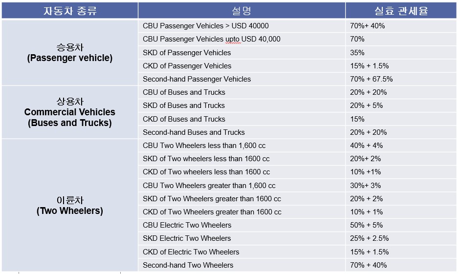 지난해보다 기본관세(BCD)가 인하되었으나, 농업 인프라 개발세(AIDC)가 도입되어 실질적인 혜택은 없는 상황이다. 다만, 오토바이에 대한 실효 관세율은 인하되었다. 자동차 종류별 실효 관세율을 아래 표에 정리했다.