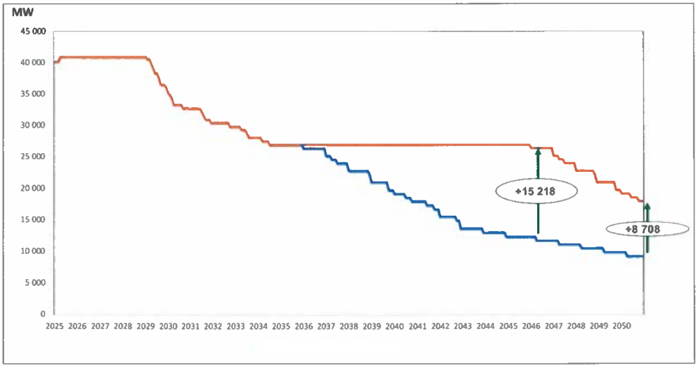 *파란색: 50년 수명 시나리오, 빨간색: 60년 수명 시나리오