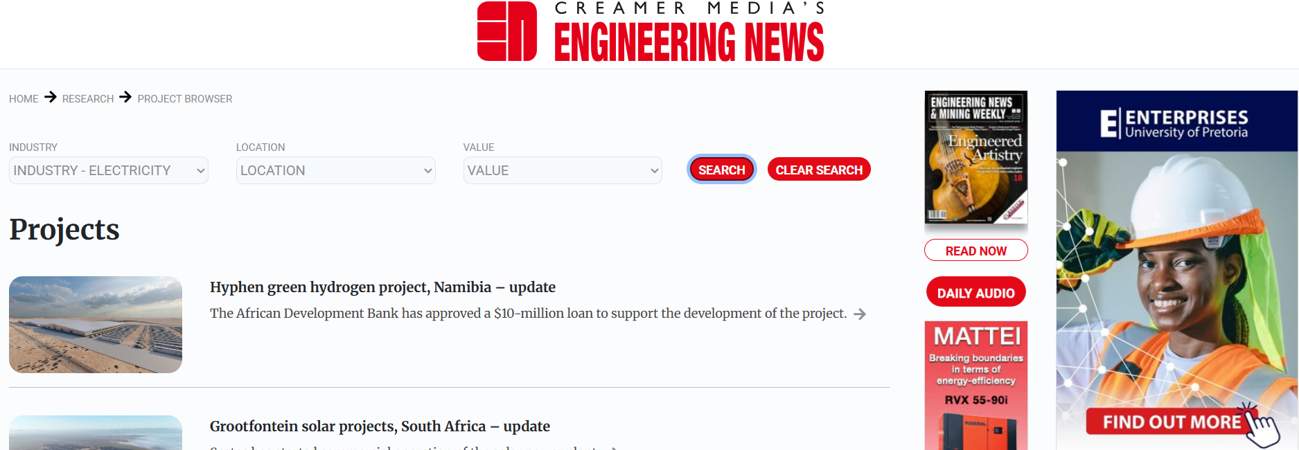 남아공과 남부 아프리카 주변 국가에서 계획 중인 전력 프로젝트 정보를 찾을 때 참고하기 좋은 플랫폼은 다음과 같다. 남아공 Engineering News에서 Project Browser 선택 후 산업(Industry)을 전력(Electricity)으로 설정하면 관련 프로젝트 정보를 볼 수 있다.