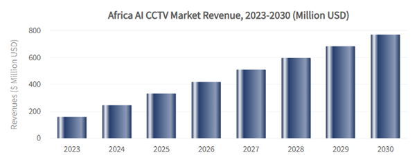 특히 AI 기반 CCTV 시스템이 상업시설, 산업현장, 공공장소 등 분야에서 수요가 증가하며 빠르게 성장하고 있다. AI CCTV는 전통적인 영상 감시 시스템(CCTV)에 인공지능(AI) 기술을 결합해 영상 데이터를 자동으로 분석하고 이상행동·객체·인물 등을 실시간으로 탐지, 식별, 추적하는 지능형 보안 감시 솔루션을 의미한다. 컨설팅 그룹 NMSC에 따르면, 아프리카 대륙의 AI CCTV 시장은 2023년 1억6042만 달러에서 2030년 7억7233만 달러로 연평균 23.3%의 성장률을 보일 것으로 전망하고 있다.