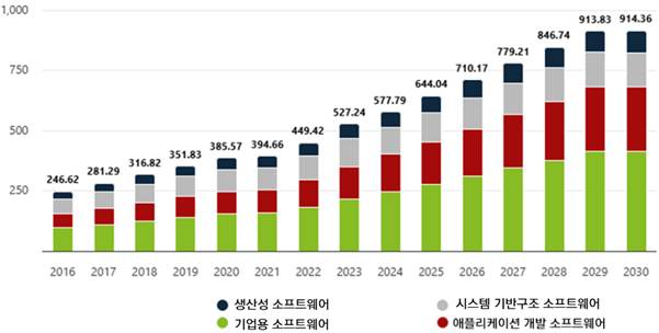 시스템 기반구조 소프트웨어는 운영체제, 보안, 데이터베이스 관리 등 IT 인프라 기반을 구성하는 영역으로, 필수 수요가 지속적으로 유지되고 있다. 애플리케이션 개발 소프트웨어는 클라우드 기반 개발환경과 DevOps 등 개발과 운영을 빠르게 연결해주는 자동화 도구 수요가 확대되면서 빠른 성장세를 보이는 부문으로 평가된다.