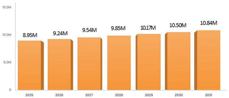 한편, 불가리아의 ICT 시장 규모 추이도 살펴볼 만하다. 이는 비록 직접적인 지표는 아니나 AI 산업과 밀접한 연관이 있어 이를 통해 해당 산업이 얼만큼 활성화되고 있는지 짐작해볼 수 있기 때문이다. 불가리아의 인공지능 산업을 뒷받침하는 ICT 시장은 완만하지만 지속적인 확대 추이를 보일 것으로 전망된다. 불가리아 ICT 시장 규모는 2025년 약 895만 달러 수준에 이를 것으로 예상된 바 있으며, 이후 2025~2030년 기간 연평균성장률이 약 3.1%에 달하면서 2031년엔 약 1084만 달러까지 시장 규모가 확대될 것으로 전망된다.