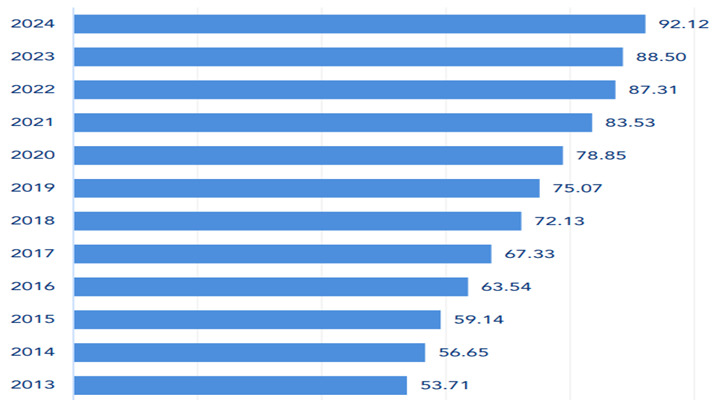 ICT 산업 성장 기반으로는 디지털 인프라의 지속적인 개선 추이가 꼽힌다. 가계 인터넷 보급률은 2013년 53.7%에서 2024년 92.1%까지 꾸준히 상승했으며, 특히 2020년 이후 증가 속도가 유지되고 있다. 이는 AI·클라우드·데이터 분석처럼 디지털 기술 활용의 전제 조건이 되는 수요 기반이 시간의 흐름에 따라 구조적으로 확대되고 있음을 시사한다.