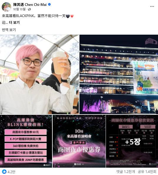 가오슝은 대형 공연장 인프라와 시정부의 적극적인 지원을 바탕으로 ‘공연 도시’로의 전환을 이루고 있으며, 그 중심에는 K-콘텐츠가 있다. 한국국제문화교류진흥원(KOFICE)의 「2024 해외한류실태조사」에 따르면, 대만은 K-POP이 ‘대중적으로 널리 인기 있다’고 응답한 비율이 65.3%로 조사 대상 지역 중 상위권을 기록했다. K-POP의 영향력은 단순한 인기를 넘어 지자체 차원의 경제 전략으로도 이어지고 있다. 가오슝 시장은 블랙핑크 콘서트 관련 게시글을 8건이나 게시하며 직접 홍보에 나섰고, 시정부는 공연 기간에 맞춰 소비 쿠폰 지급 및 연계 프로그램을 운영하며 수익 극대화에 적극 나섰다.