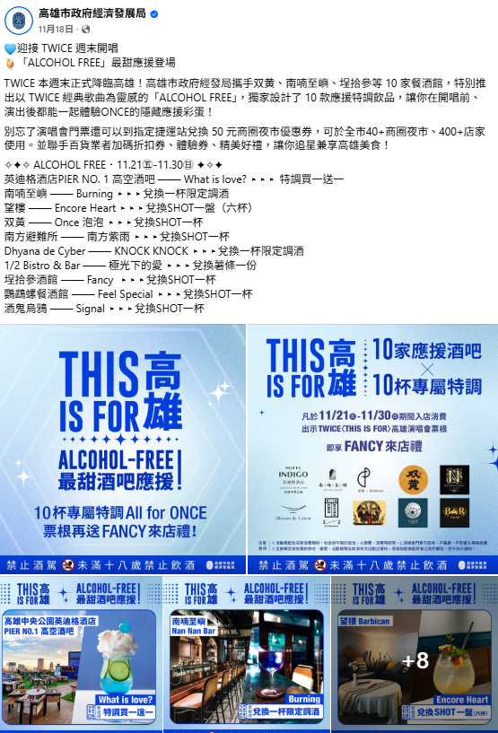 트와이스 공연을 맞아 가오슝시는 지역 10개 바와 연계해 ‘알코올 프리(ALCOHOL FREE)’ 이벤트를 진행했다. 참여 업소들은 트와이스 대표곡에서 착안한 시그니처 칵테일을 판매했고, 콘서트 티켓을 제시하면 음료 교환 및 할인 혜택을 제공하는 방식으로 팬들의 방문을 유도했다. 특히 공연 종료 후 야간 시간대 소비를 겨냥해 공연장에서 야간 상권으로 자연스럽게 이어지는 소비 동선도 고려했다.