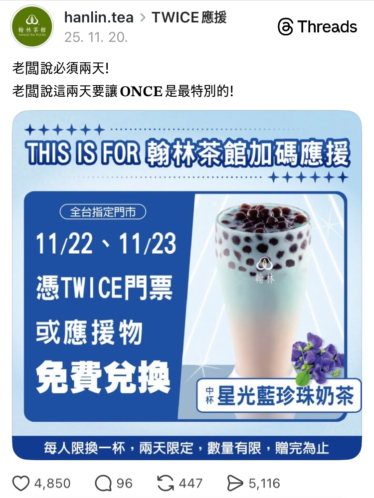 대만의 음료 브랜드 한림차관(翰林茶館)은 트와이스 콘서트 일정에 맞춰 한정 메뉴 ‘별빛 블루 버블티(星光藍珍珠奶茶)’를 출시하고, 티켓 및 응원봉 제시 시 해당 음료를 무료로 제공하는 이벤트를 진행했다. 음료는 트와이스의 앨범 ‘This Is For’를 연상시키는 색감을 활용해 팬들 사이에서 ‘SNS 인증용 음료’로 빠르게 확산됐다.