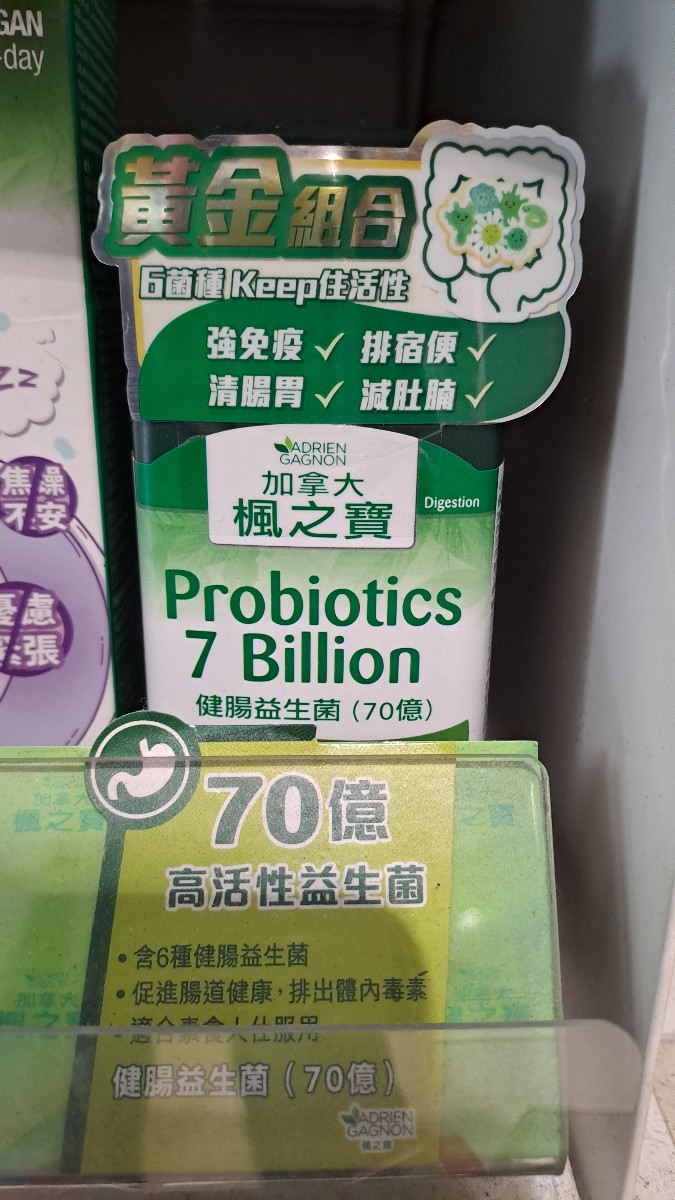 프로바이오틱스 제품의 경우, Adrien Gagnon의 Probiotic 7 Billion은 6종의 프로바이오틱스와 프락토올리고당(FOS)을 함유한 제품으로, 장내 유익균 균형을 유지하고 배변 환경을 개선해 위장 건강과 전반적 컨디션을 관리하는 데 도움을 주도록 설계되어 있다.