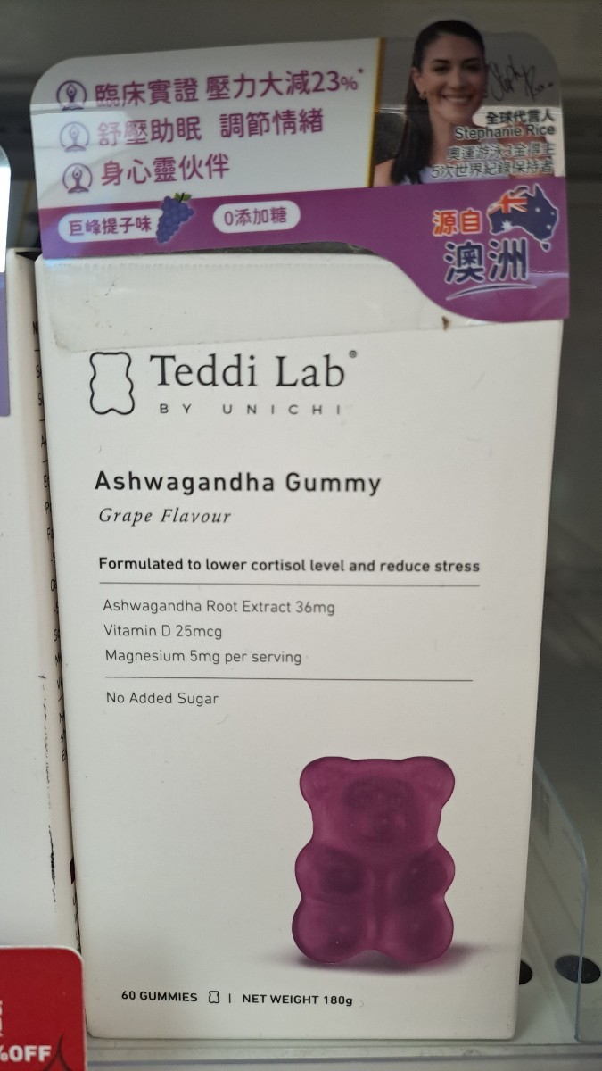 구미 캔디도 건강기능식품의 인기 있는 제형으로 자리 잡고 있다. Unichi Teddi Lab의 Ashwagandha Gummy는 아슈와간다 추출물과 일부 비타민·미네랄을 함유한 곰 모양 구미로, 스트레스 관리와 수면의 질 개선에 관심 있는 소비자를 겨냥한 제품이다. 달콤한 포도 맛과 간식 같은 식감 덕분에 알약에 부담을 느끼는 홍콩 소비자들이 일상 속에서 가볍게 섭취할 수 있는 스트레스 케어 옵션으로 활용되고 있다.