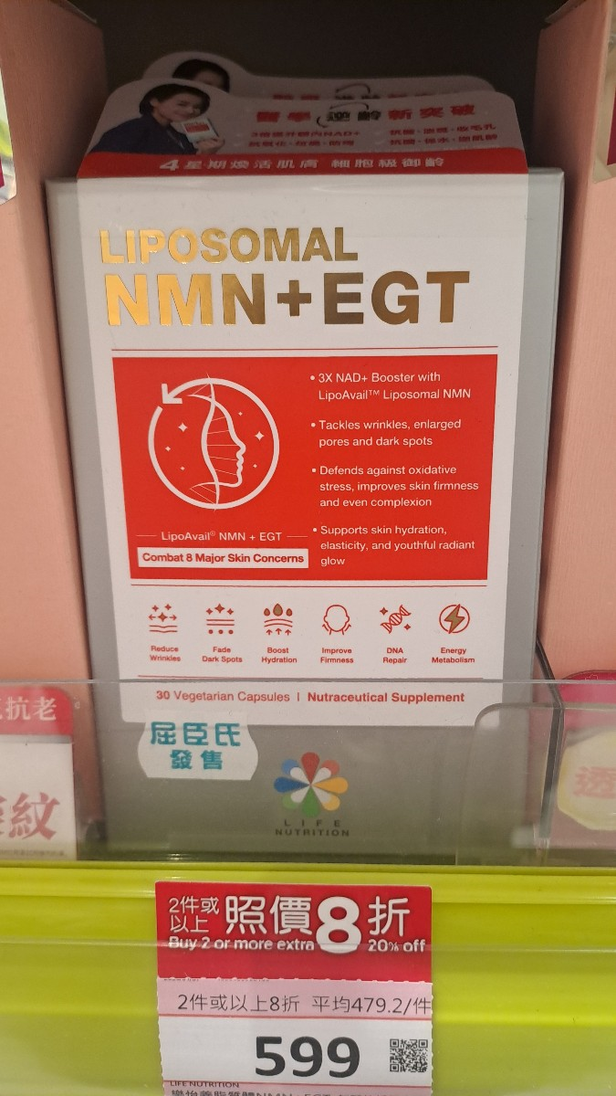 예를 들어, Life Nutrition의 Liposomal NMN+EGT 캡슐은 리포좀 기술을 적용한 NMN과 항산화 성분 에르고티오네인(EGT)을 결합해 세포 에너지 대사와 피부 항산화 케어를 동시에 지원하는 이너뷰티 제품으로 홍콩 드럭스토어에서 판매되고 있다. 브랜드 설명에 따르면, 이 제품은 NAD+ 생성을 돕는 NMN과 EGT의 조합을 통해 피부 당화와 산화 스트레스, 자외선으로 인한 손상을 줄이고 피부 보습·탄력·광채 개선에 도움을 줄 수 있도록 설계되었다.