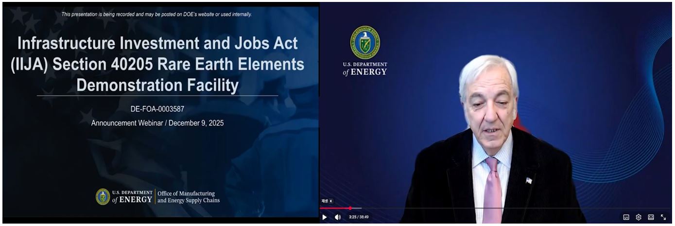 <미국 에너지부의 희토류 공급망 강화를 위한 자금 지원 기회 공고 관련 웨비나 화면>