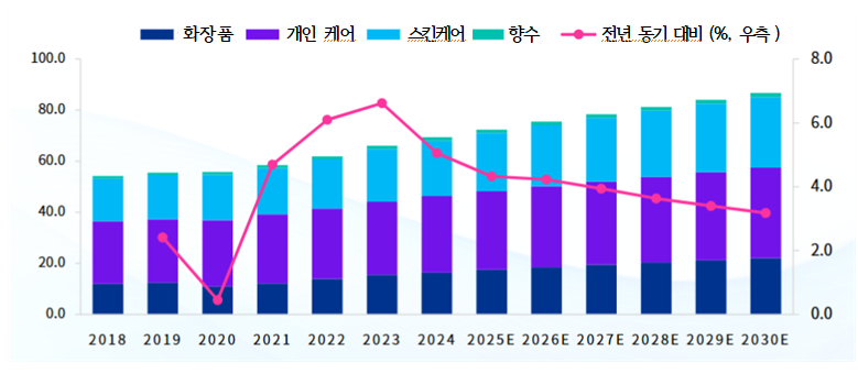 2025년 중국의 뷰티 및 퍼스널 케어 산업은 얼굴 및 입술 화장품, 스킨케어, 향수, 헤어 케어 제품, 탈취제, 면도 용품, 뷰티 테크 제품 등을 포함하며, 복잡하고 다변화된 동향을 보이고 있다. Statista와 KPMG 보고서에 따르면, 2025년 산업 시장 규모(매출액 기준)는 약 724억1000만 달러로 추정되며, 2030년에는 867억2000만 달러 규모에 도달할 것으로 예상된다.