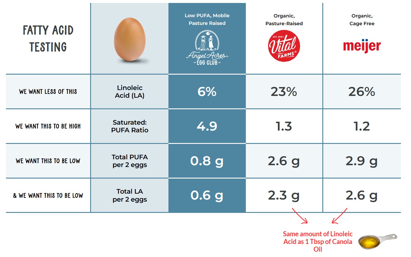 노리시 푸드 클럽이 미국 미시간주립대와 협력해 실험한 분석에 따르면 바이탈 팜스의 유기농 방목형 달걀과 메이저(Meijer)의 케이지 프리 달걀의 리놀레산 함량이 거의 동일했다. 문제는 바이탈 팜스 유기농 방목형 달걀이 메이저 제품 달걀 대비 약 2배 정도 가격이 비싸다는 점이다. 물론 사육환경에 따라 닭의 스트레스 레벨은 다를 수 있겠으나, 영양 성분을 중요하게 생각하는 소비자들의 입장에서는 납득하기 힘든 결과일 것이다. 더 흥미로운 점은 같은 유기농 방목형 달걀이라도 사료에 따라 결과가 달라진다는 사실이다. 에인절 에이커스(Angel Acres) 달걀의 리놀레산 함량은 0.6g으로 바이탈 팜스(2.3g)의 ¼ 수준이다. 지방산 비율로는 에인절 에이커스는 6%, 바이탈 팜은 23%로 4배 가까이 차이가 났다.